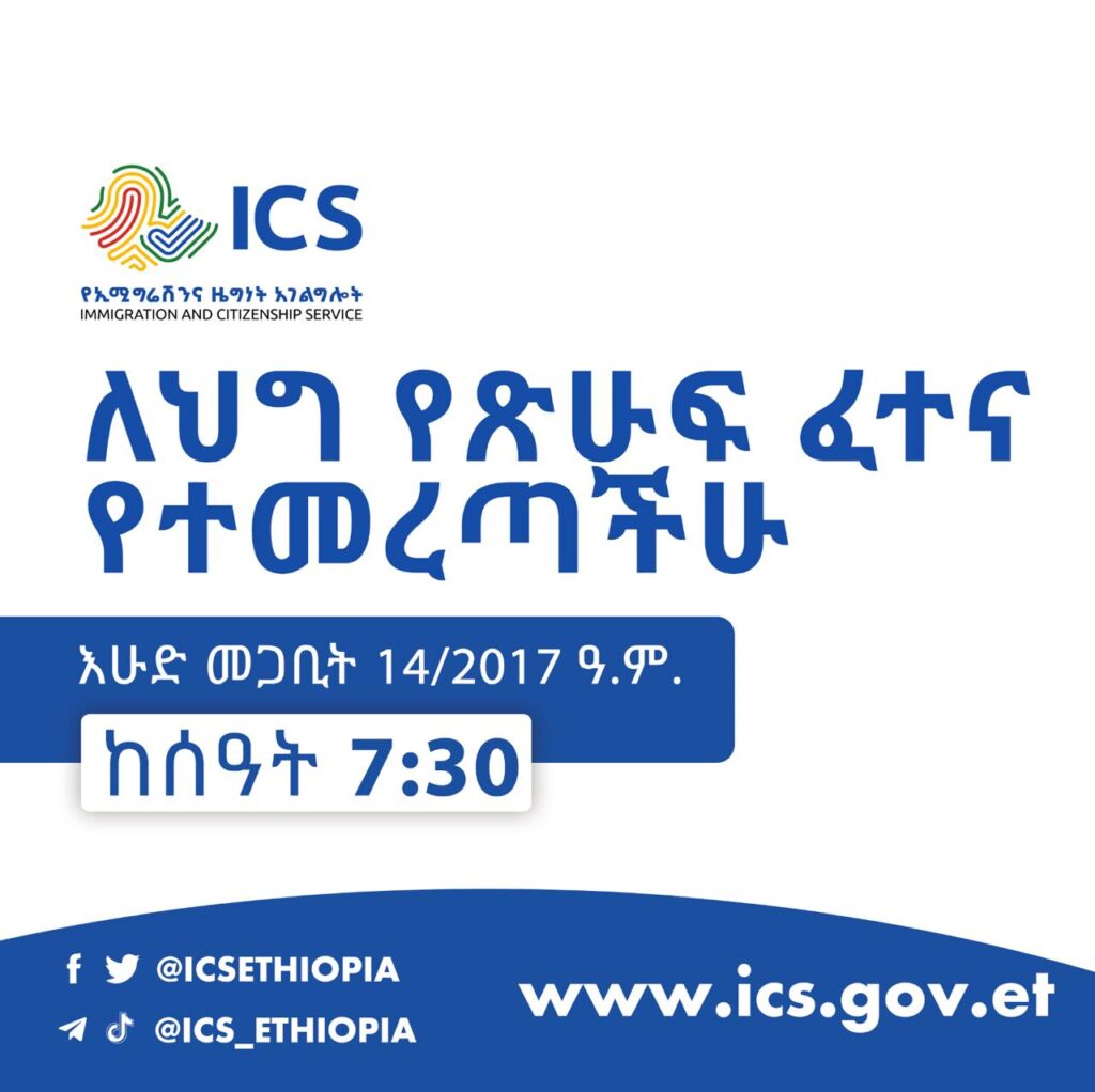 - ፈተናው ጠዋት 2:30 ከሰአት 7:30 የሚጀምር ሲሆን በሰአቱ የአልተገኘ ተፈታኝ የማናስተናግድ መሆኑን እንገልፃለን።