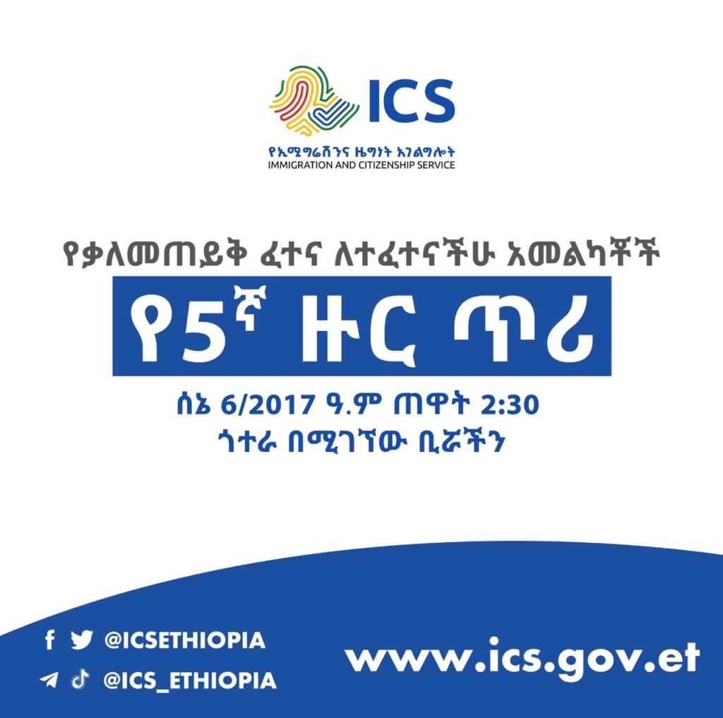 በኢሚግሬሽንና ዜግነት አገልግሎት መጋቢት 14 ቀን 2017 ዓ.ም የተሠጠውን ፈተና ወስዳችሁ የቃለመጠይቅ ፈተና የተፈተናችሁ አመልካቾች በአገልግሎት ተቋሙ የውድድር መስፈርት መሠረት ለስራ ቅጥር ያለፋችሁ ስም ዝርዝራችሁን ከዚህ በታች የለቀቅን ሲሆን ሰኔ 06/2017 ዓ.ም 2:30 ሰዓት ጎተራ በሚገኘው ቢሯችን ሪፖርት እንድታደርጉ እየገለጽን ከተጠቀሰው ቀን ውጪ የሚመጡ አመልካቾችን የማናስተናግድ መሆኑን እናሳውቃለን።