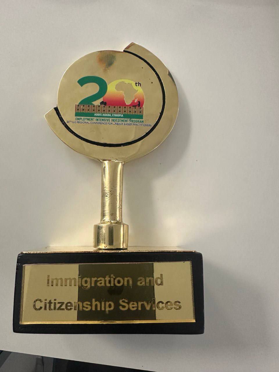 በዚህም ኢሚግሬሽንና ዜግነት አገልግሎት ከ2000 በላይ እንግዶች እና 30 ሚኒስትሮችን የቪዛ እና የኢሚግሬሽን አገልግሎት በተቀላጠፈ መንገድ በመስጠት አህጉራዊ ጉባኤው በስኬት እንዲጠናቀቅ ላበረከተው አስተዋፅኦ የእውቅና ሽልማት ተበርክቶለታል፡፡