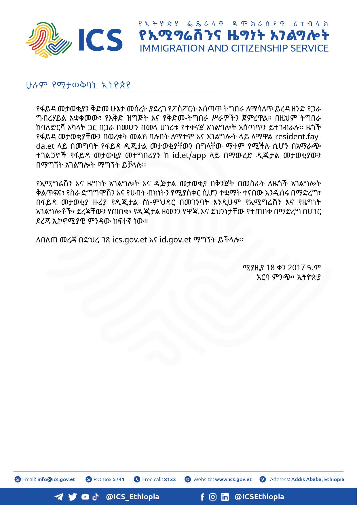 ለበለጠ መረጃ በድህረ ገጽ ics.gov.et እና id.gov.et ማግኘት ይችላሉ፡፡