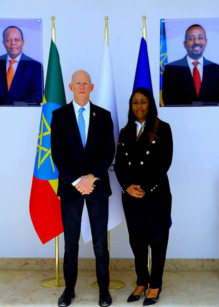 የኢሚግሬሽንና ዜግነት አገልግሎት ዋና ዳይሬክተር ወ/ሮ ሰላማዊት ዳዊት በአሜሪካን የአሸባሪዎች መለያ ማዕከል ዋና ዳይሬክተር ሚካኤል ግላሺን የተመራ የልዑካን ቡድንን በጽ/ቤታቸው ተቀብለው አነጋግረዋል።